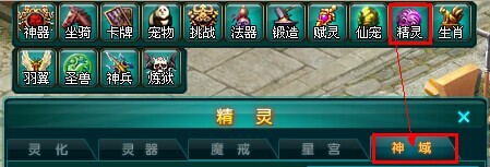 玩家点击游戏界面上方的【精灵】图标,打开精灵系统后,选择“神域”即可打开升级界面。