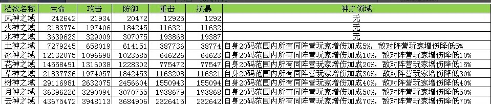 成功唤醒神域,不仅可获得强大的属性加成,除了生命、攻击、防御、重击等基本属性之外,更附加抗暴、增伤、减伤特殊属性。具体属性加成如下图所示:
