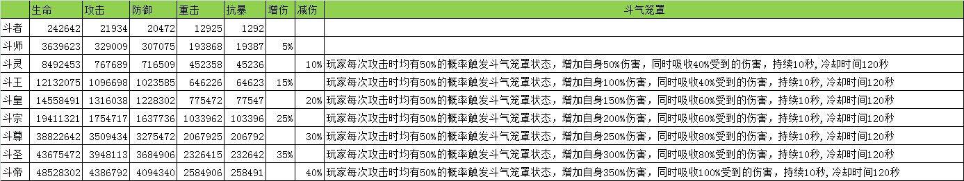 成功凝聚斗气后,可获得生命、攻击、防御、重击、抗暴、增伤、减伤等属性加成!具体数值如下图所示: