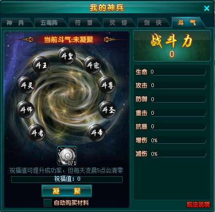 注:①斗气凝聚每次均有几率成功,失败则会增加祝福值。祝福值越高,凝聚成功的几率越高;