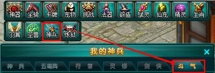 玩家点击游戏页面上方的图标【神兵】,打开神兵系统后,选择“斗气”,即可打开升级界面。