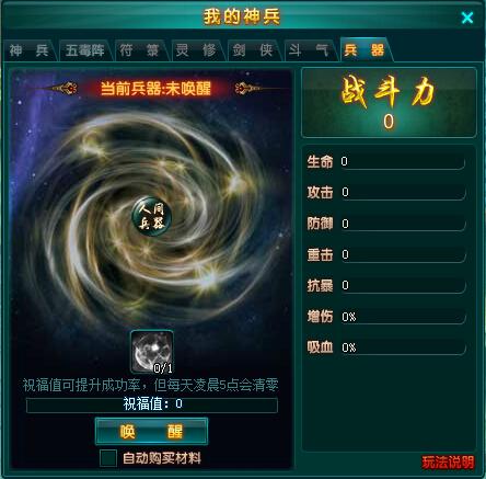 注:① 兵器每次唤醒均有几率成功,唤醒失败则会获得祝福值。祝福值越高,唤醒成功的几率越高;