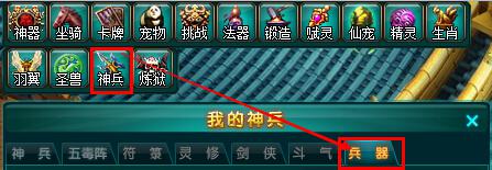 玩家点击游戏页面上方的图标【神兵】,打开神兵系统后,选择“兵器”,即可打开升级界面。