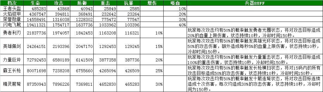 成功唤醒兵器可获得可观的属性加成,除了生命、攻击、防御、重击等基础属性之外,更附加抗暴、增伤、吸血等特殊属性。具体数值如下图所示: