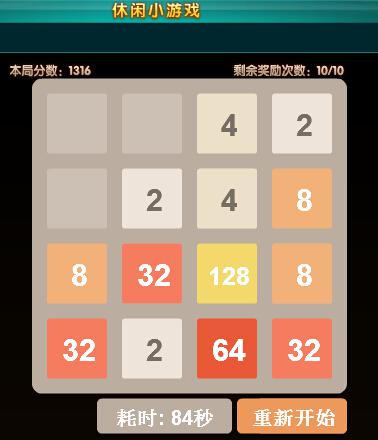 7、新增“休闲小游戏”—2048;系统每次会增加一个数字,可以选择四个方向(键盘方向键↑/↓/←/→控制数字相加 ),然后数字会按方向移动,遇到相同的数字就会合并,合并出2048这个数字即可闯关成功。