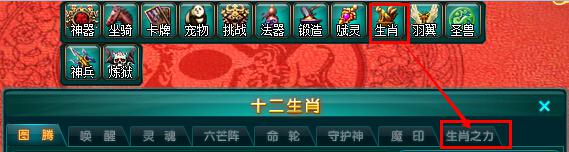 玩家点击游戏页面上方的图标【生肖】,打开生肖系统后,选择“生肖之力”,即可打开升级界面。