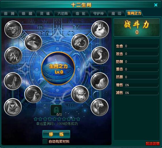 注: ① 每次修炼生肖之力均有几率成功,修炼失败则有概率获得幸运星。幸运星越高,修炼成功的几率越高;