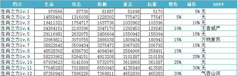 成功提升生肖之力等级,可获得强大的加成属性,除了生命、攻击、防御、重击等基本属性之外,更附加抗暴、增伤、减伤等特殊属性!具体数值如下图所示: