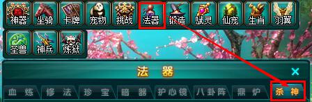 玩家点击游戏界面上方的【法器】图标,打开法器系统后,选择“杀神”即可打开升级界面。