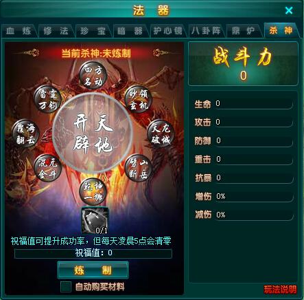 玩家开启法器系统后,系统自动激活杀神系统。