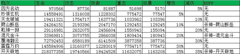 成功炼制杀神,可获得生命、攻击、防御、重击、抗暴、增伤、减伤等属性加成。具体数值如下图所示: