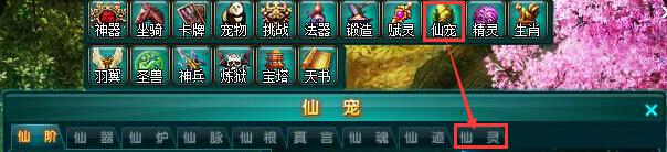 玩家打开游戏页面上方的图标【仙宠】,打开仙宠系统界面后,选择“仙灵”,即可打开升级界面。