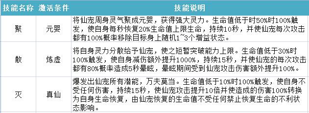 技能说明:将仙宠周身灵气聚成元婴,获得强大灵力。生命值低于时50%时100%触发,使自身每秒恢复20%生命值上限生命,持续10秒,并使仙宠每次攻击都有100%概率移除目标身上随机1~3个增益状态;