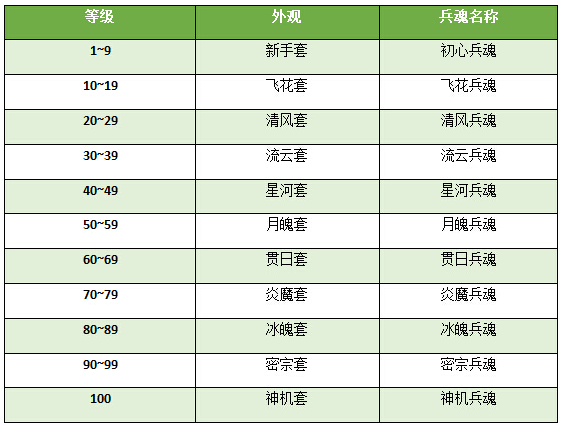 1、兵魂外观根据玩家自身的基础等级而变化哦,每10级一套套装外观,等级越高外观越酷炫。