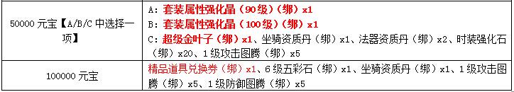 现金豪礼三:(超级优惠,不计算抵用券)活动期间,所有玩家累计充值满10000元宝,除了可得到对应元宝,免费领取【月末庆典豪华礼包二】: