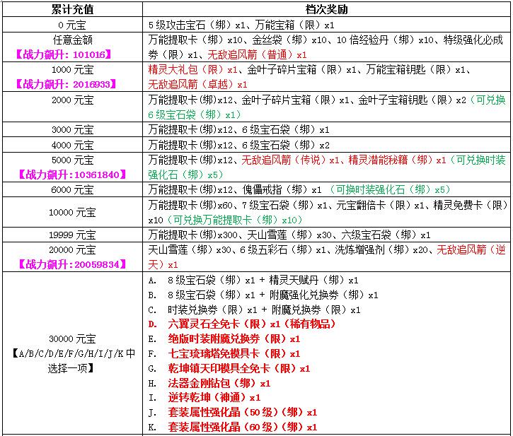 好礼一:活动期间每累计充值 10000元宝,除了可获得对应的元宝外,还可到右上角 限时活动界面 领取以下增值好礼(仅可兑换10次):