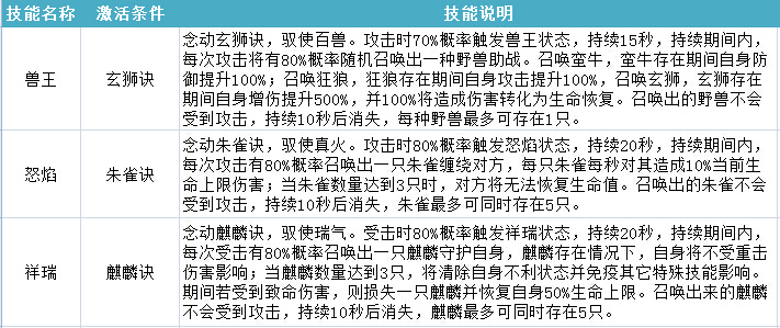 技能说明:念动玄狮诀,驭使百兽。攻击时70%概率触发兽王状态,持续15秒,持续期间内,每次攻击将有80%概率随机召唤出一种野兽助战。召唤蛮牛, 蛮牛存在期间自身防御提升100%;召唤狂狼,狂狼存在期间自身攻击提升100%,召唤玄狮,玄狮存在期间自身增伤提升500%,并100%将造成伤害转 化为生命恢复。召唤出的野兽不会受到攻击,持续10秒后消失,每种野兽最多可存在1只;