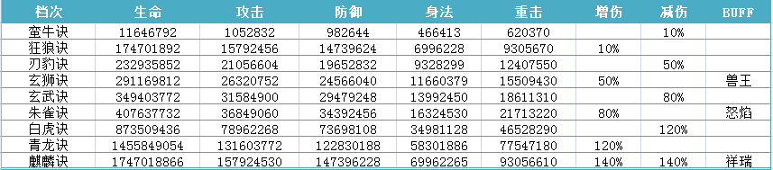 成功研习御兽,可获得生命、攻击、防御、身法、重击、增伤、减伤等可观的属性加成。具体数值如下图所示: