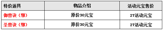 元宝限时抢购:活动期间,所有玩家可使用 1000元宝 在右上角 御兽尝鲜 界面 购买超值奖励: