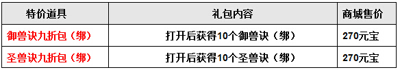 新系统特惠礼包:(超值奖励,不计算元宝抵用券):活动期间,所有玩家累计充值满10000元宝,除了可获得对应的元宝外,还可到右上角御兽尝鲜界面免费领取: