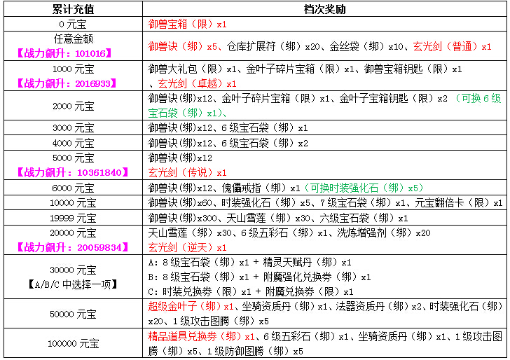 新系统特权:(超值奖励,不计算元宝抵用券)活动期间,累计充值满2888元宝的玩家,可获得新系统尝鲜超级特权,使用万能提取卡兑换超值礼包(超值尝鲜 每人仅限兑换一次):