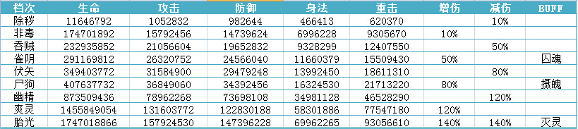 技能说明:胎光之魂能使万灵皆归为寂灭。攻击时80%概率触发灭灵,使被攻击目标进入灵魂虚无状态,持续20秒,期间攻击或受击均无法触发特殊技能,并 且受到重击将额附带一层灵魂破碎状态,持续10秒,每层每秒造成500亿固定伤害,无视防御减伤,叠加5层后buff消失并将立即造成人物当前生命上限 99%的伤害。