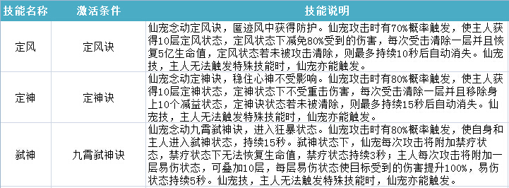 技能说明:仙宠念动定神诀,稳住心神不受影响。仙宠攻击时有80%概率触发,使主人获得10层定神状态,定神状态下不受重击伤害,每次受击清除一层并且 移除身上10个减益状态,定神诀状态若未被清除,则最多持续15秒后自动消失。仙宠技,主人无法触发特殊技能时,仙宠亦能触发;