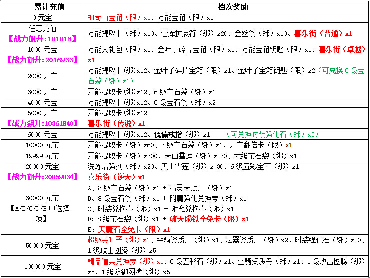 奖励一:活动期间,玩家累计充值达到相应条件,即可到右上角 限时活动 界面 领取大量超值好礼,具体档次奖励如下: