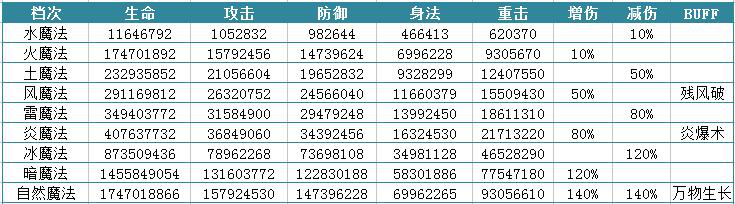 成功封印凶兽,可获得生命、攻击、防御、身法、重击、增伤、减伤等可观的属性加成。具体数值如下图所示: