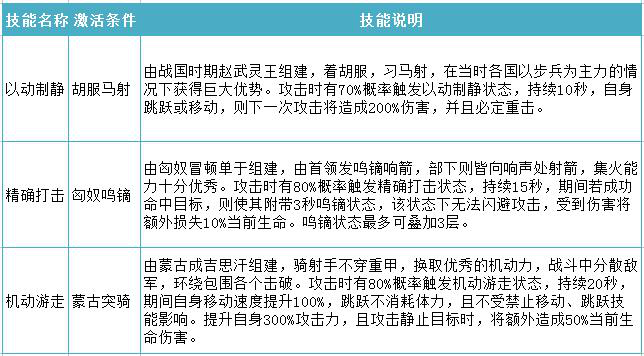 技能说明:由蒙古成吉思汗组建,骑射手不穿重甲,换取优秀的机动力,战斗中分散敌军,环绕包围各个击破。攻击时有80%概率触发机动游走状态,持续20 秒,期间自身移动速度提升100%,跳跃不消耗体力,且不受禁止移动、跳跃技能影响。提升自身300%攻击力,且攻击静止目标时,将额外造成50%当前生 命伤害。