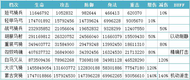 成功训练骑射,可获得生命、攻击、防御、身法、重击、增伤、减伤等可观的属性加成。具体数值如下图所示: