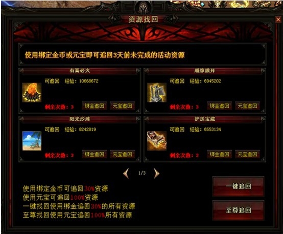 可用绑金和元宝代替活动立即完成牌,寻回未参与活动的经验。绑金找回50%的资源,元宝找回100%资源,同时加入了一键找回与至尊找回功能。