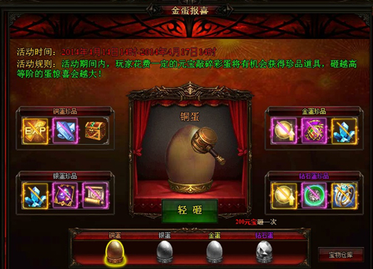 1、 彩蛋共分青铜、白银、黄金、钻石四个等阶,对应相应品质的奖励,砸蛋费用都是一样的,为200元宝;