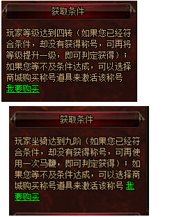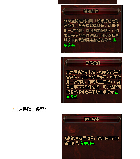 1、条件触发类型:某些称号,玩家可能已经符合条件却没有获得,需要玩家在那方面进行数据变动方可判定,例如:等级提升、坐骑经验提升、翅膀经验提升等