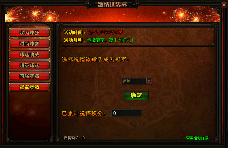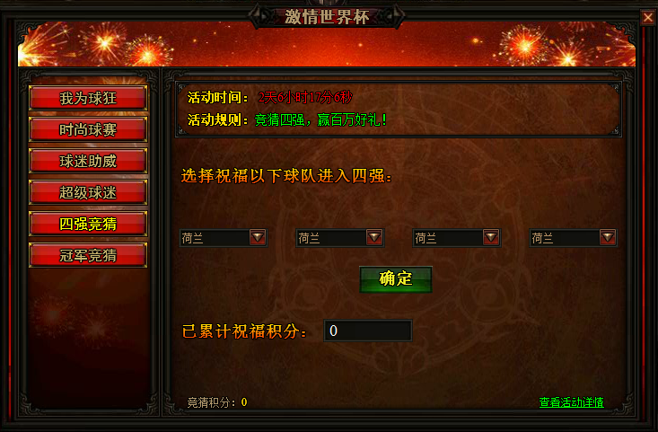 3、玩家可以通过祝福积分参与四强竞猜;4支球队选中后不可改选;