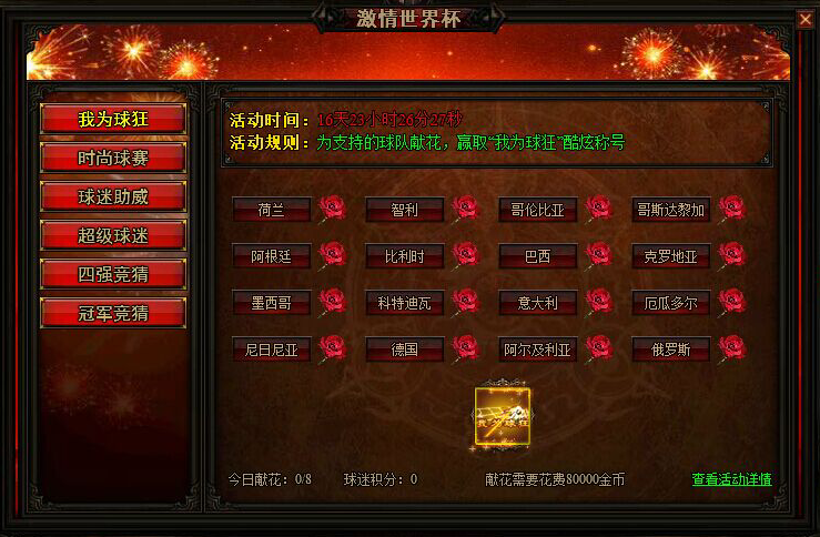 2、活动期间玩家可以选择为某支球队献花,献花需要消耗一定金币,每个玩家每天可献花8次。玩家在献花的时候有机率获得“我为球狂”称号,奖励邮件发送;
