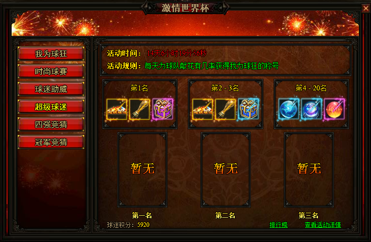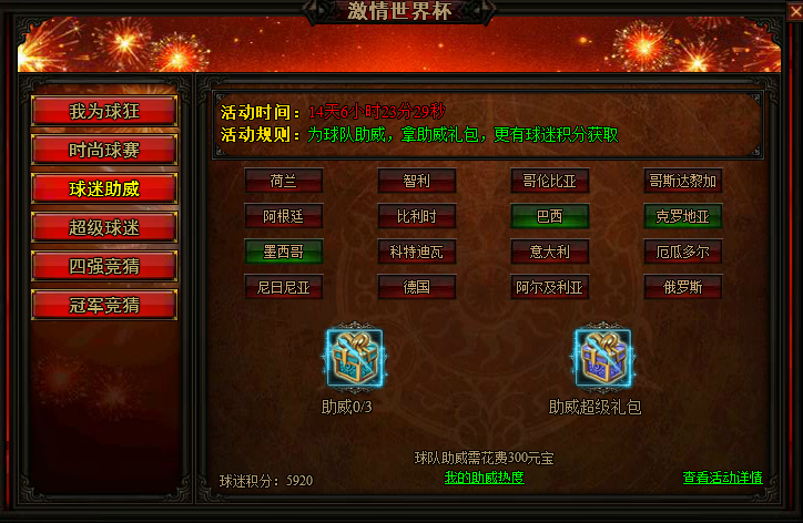 5、如果玩家选择助威的球队获得冠军且助威达到一定额度时,将获得“助威超级礼包”;