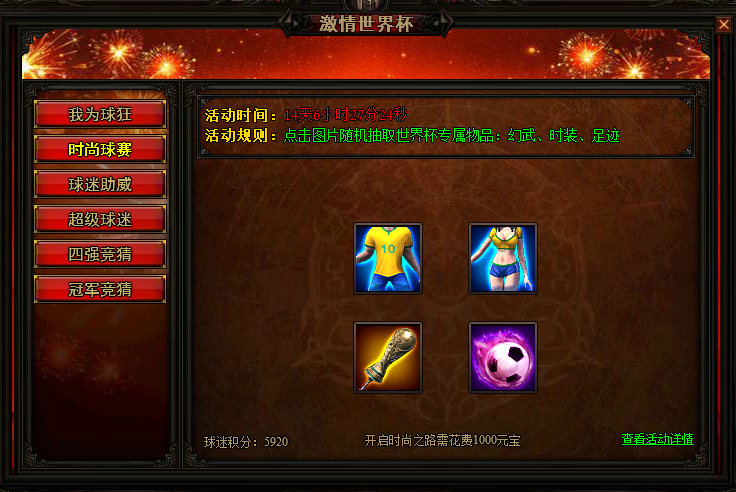 2、活动期间,玩家可以选择支持的球队进行助威,每次助威将消耗一定的元宝,助威成功的玩家将获得一定的球迷积分;