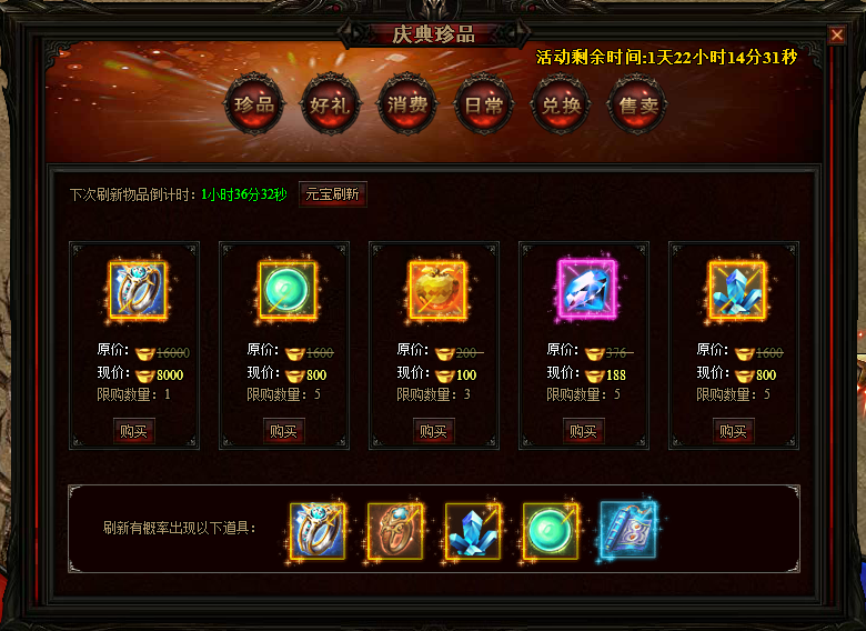 2、一个时间段内,界面售卖五种道具,每过2个小时免费刷新道具一次,玩家也可以通过元宝刷新道具,元宝刷新每次20元宝;