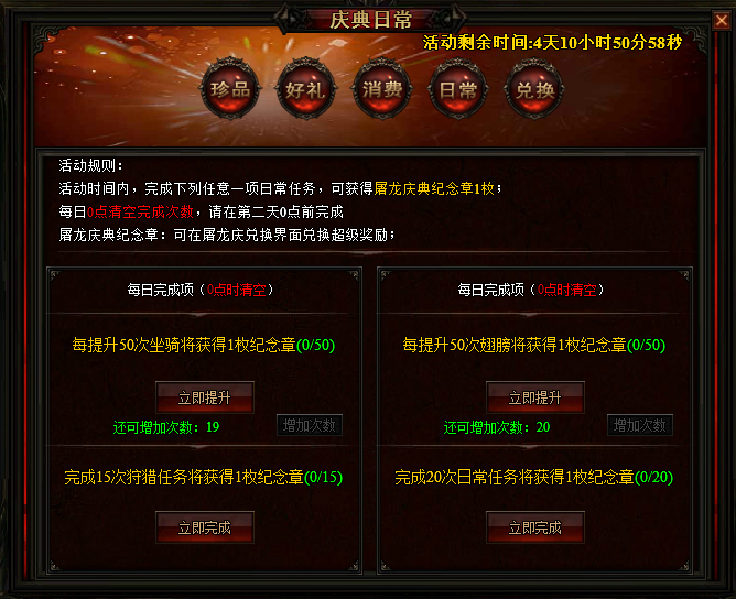 活动内容:活动期间内,完成相应的日常任务将获得1枚屠龙庆典纪念章,可用来兑换丰厚奖励。