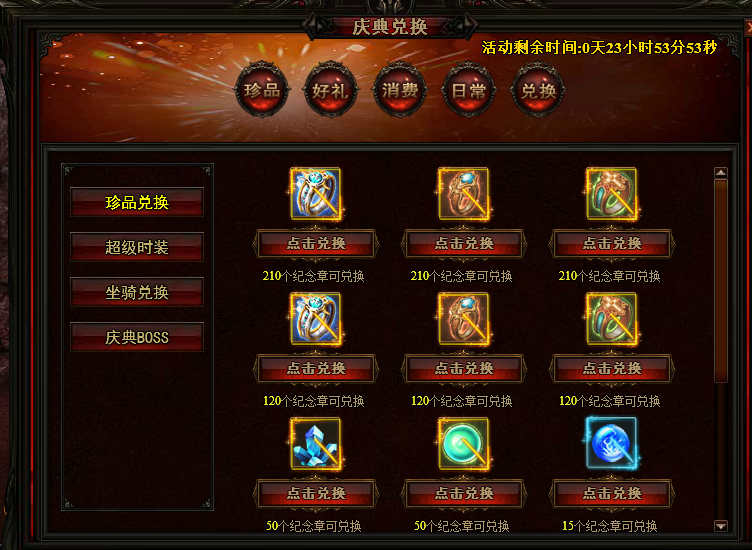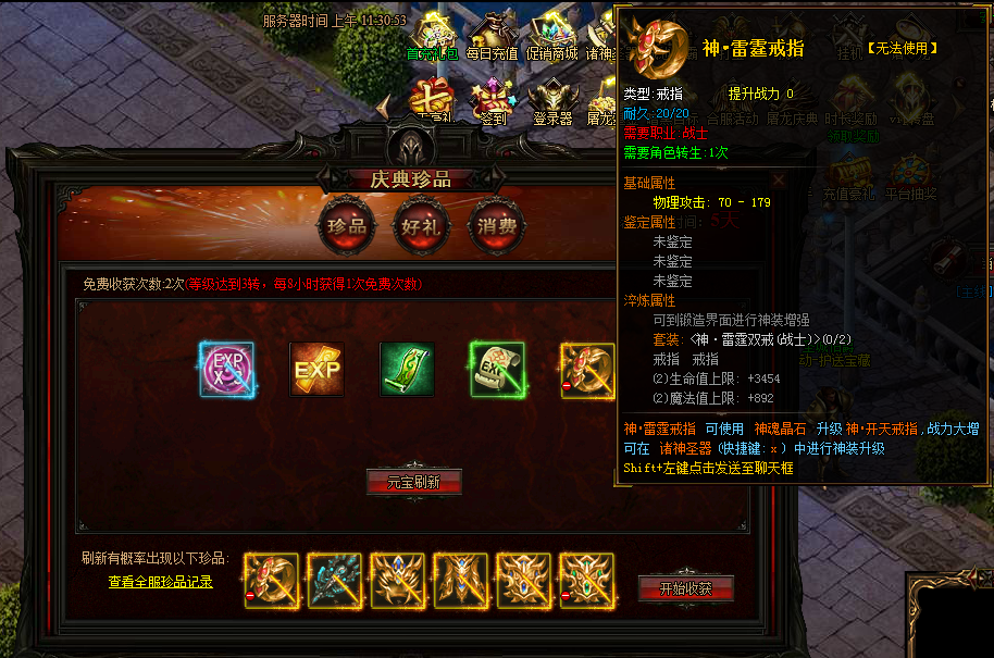 活动奖励: 神戒、高级装备、勋章、神魂晶石、高级宝石等。