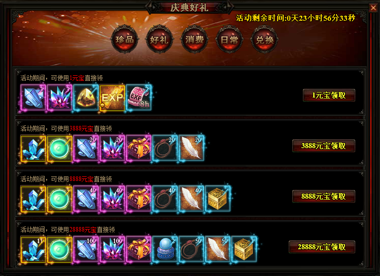 28888元宝:天神精华*11、龙魂之玉*8、装备升级石*100、神魂晶石*100、5级攻击宝石礼包*3、转生灵魄*3、马鞭*50、羽毛*50、金盒*3.