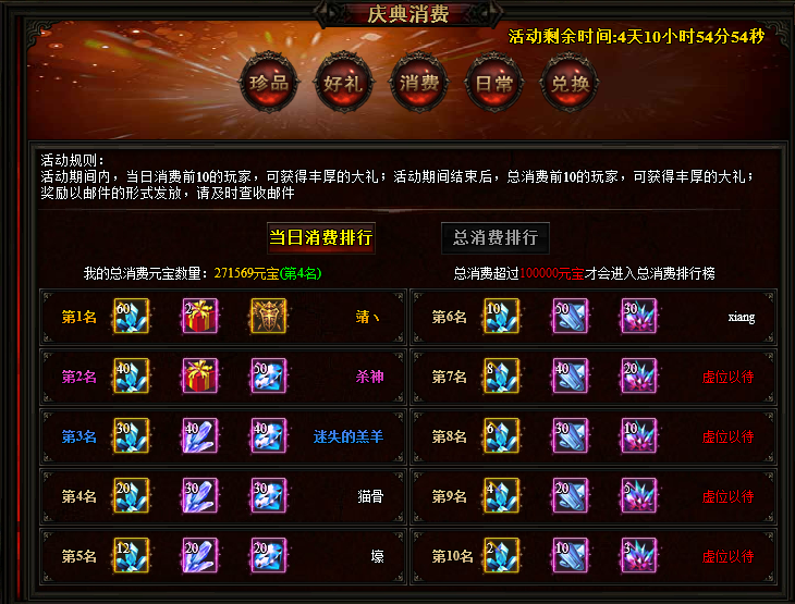 活动内容:活动期间内,当天消费前10的玩家,可获得丰厚的大礼;活动结束后,总消费前10的玩家还能获得终极排行奖励。奖励以邮件形式发放。