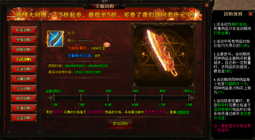 活动期间,全服所有玩家购买同种物品的数量越多,该物品折扣越低,最低可至5折。活动结束时,若物品最终价格低于购买时花费的价格,系统将会通过邮件退还差价。