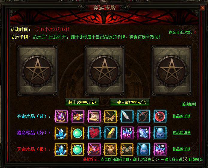 7、一键天命将赠送玩家三次免费翻牌次数;