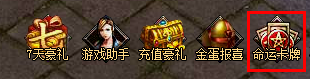 “命运卡牌”,暗黑屠龙掀开颠覆命运的序章,玩家可以尝试翻开那张属于自己命运的卡牌,翻开卡牌玩家有可能富甲天下,有可能实力飞升,也有可能一无所获,命运之门已经打开,快去尝试逆天改命吧!