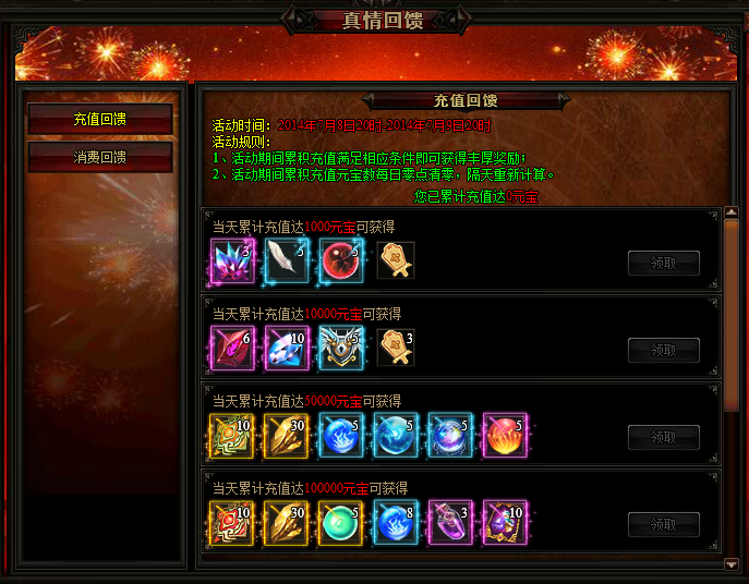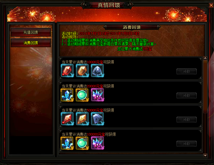 2、活动期间,累计消费、充值元宝数每日零点清零,隔天重新计算;