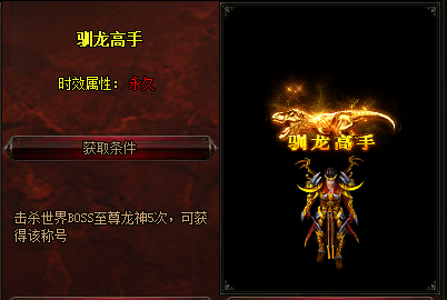 遵从满月的召唤,暗黑大陆出现了一赤色巨龙,龙吟九霄,霸道之气满世界的屠龙勇士皆有耳闻。如此少见的彪悍巨龙,定能爆稀世至宝,于是,各地勇士蜂拥而至,纷纷开始挑战这新世界的至尊龙神。传击败此巨龙有几率掉落拉风的龙族坐骑,多次击杀还能获得屌炸驯龙高手称号。究竟谁能获得,定是那至尊皇者!