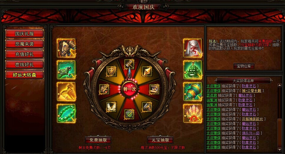 活动详情:活动期间,3转40级以上的玩家每天拥有一次免费抽取宝物的机会,再次抽取宝物则需要消耗元宝,元宝抽取的次数不限。抽取到的物品默认放入玩家的屠龙仓库中。