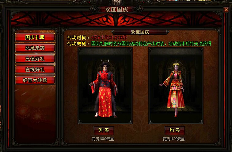 活动详情:国庆活动期间,特定产出高贵华丽的国庆礼服时装,限时抢购,机不可失哦!参与等级60级。